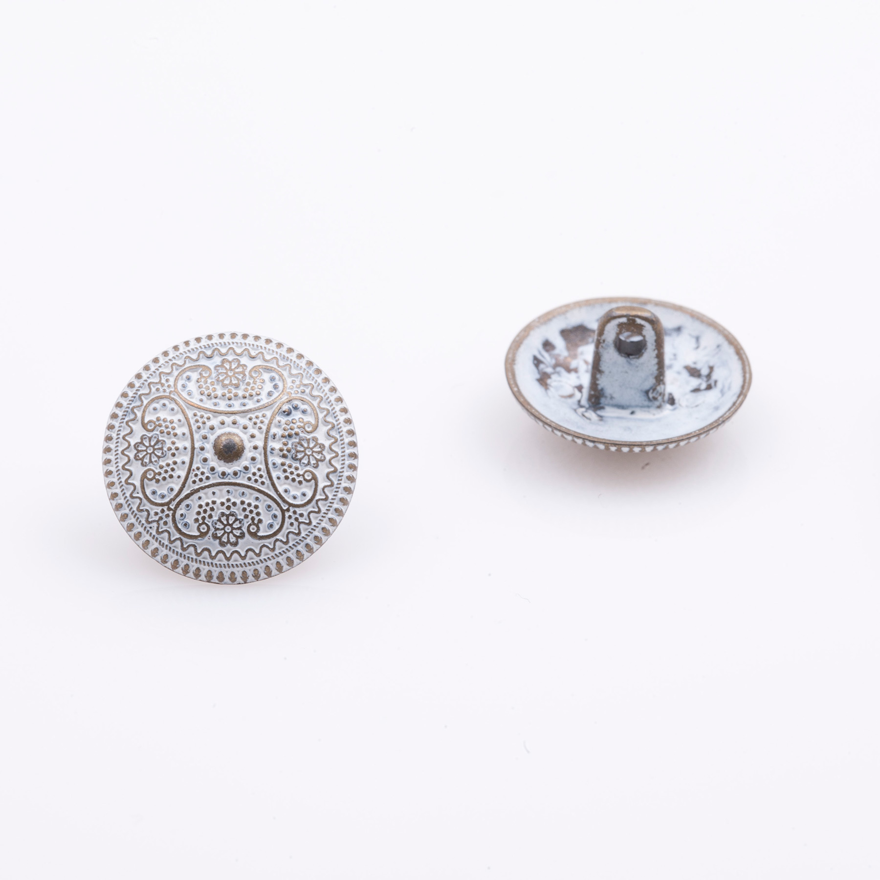Sew-On Shank Button, Alloy material, With Design, 19mm, Anti Brass-White printed color.